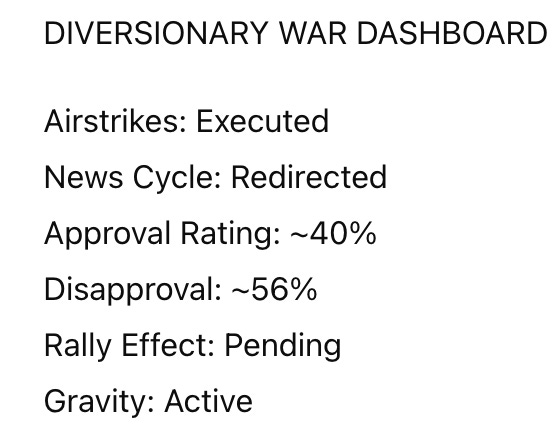 So yes, military action can lift approval briefly. But you can’t bomb your way out of political trouble and stay popular: rallies are conditional, often brief, and no match for a long, ugly war or a scandal that won’t quit.